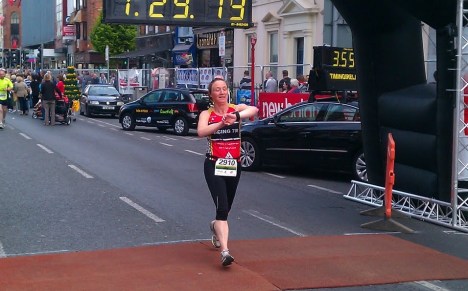 Through 32 I began to feel tired and my pace became slower. This part was more challenging. We ran into a head wind and some slow drags but I took them all on and kept running. Back in the city centre the crowd was swelling, a definite buzz in the air, but yet again we were directed away from the city for the final few miles. Past the Treaty stone, Thomond Park , a pull up past the Gaelic Grounds and right at the Union Cross all very famillar territory for me, with my gang cheering me on at just the right moment.